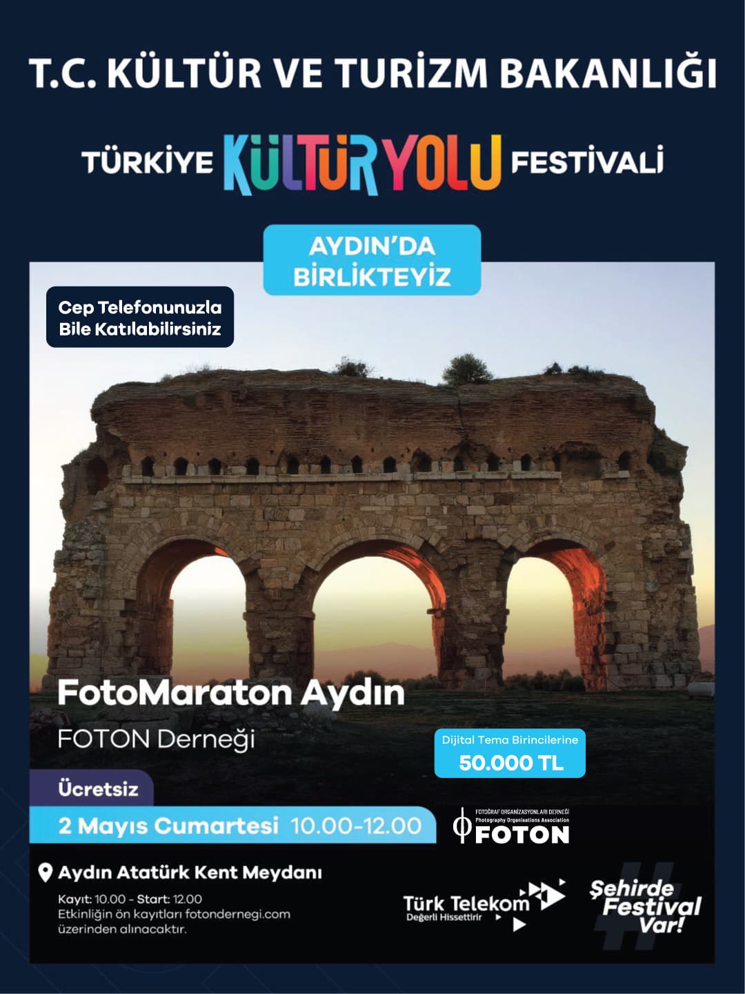 Fotoğraf Teslimleri: Tüm fotoğrafların teslimi www.fotondernegi.com üzerinden 2 Mayıs 2026’da saat 23.59’a kadar gerçekleşecektir. Cep telefonu ile katılan katılımcılar mobil kategori fotoğraflarını ayrıca #AydınKültürYoluFestivali #FotoMaratonAydın hashtagleri ile herkese açık Instagram hesapları üzerinden paylaşırlar. Tüm fotoğrafların orjinal halleri (adı bile değiştirilmeden) internet sitesine yüklenir.